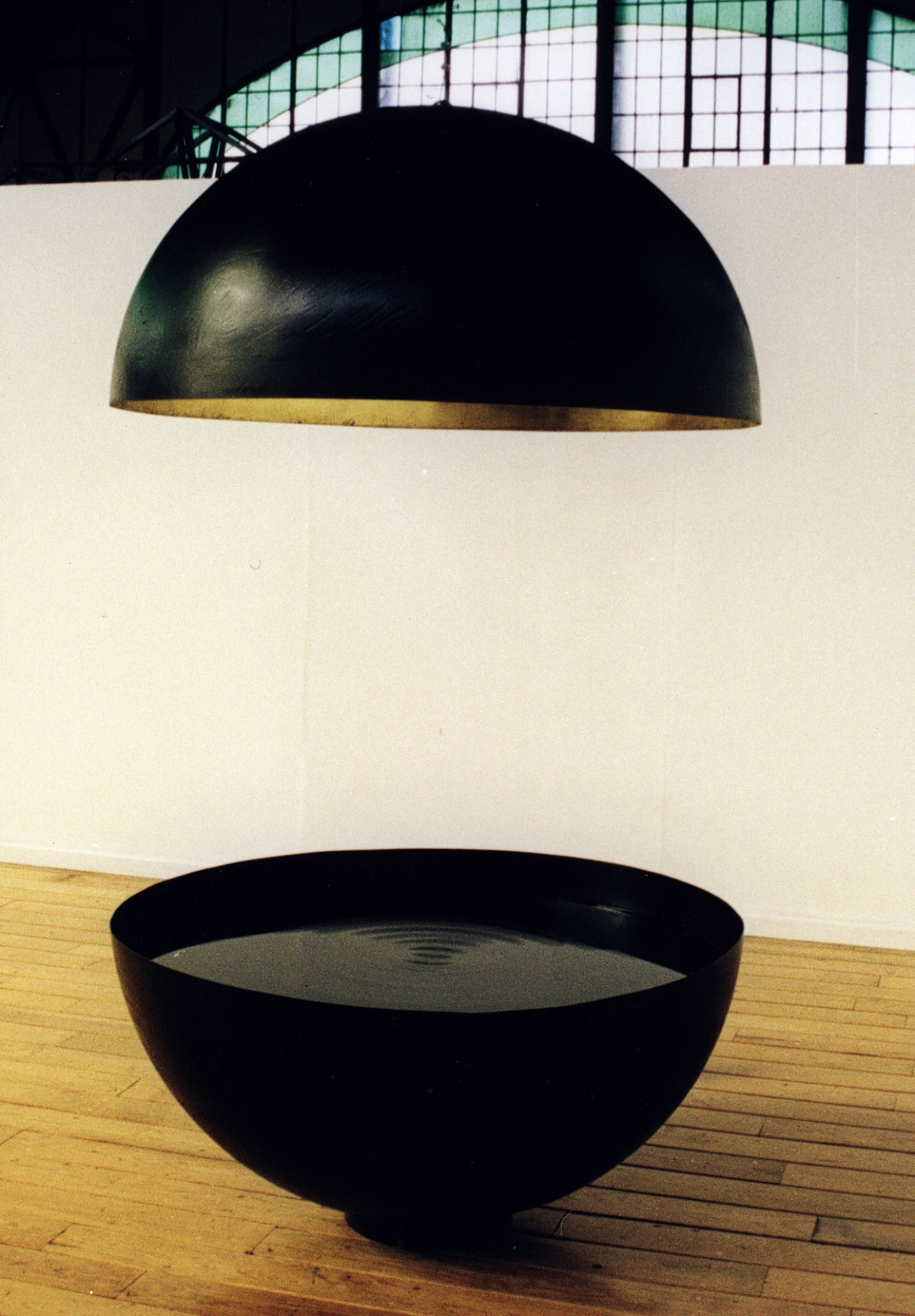 In this piece Yvonne Domenge builds a virtual projection in the symbolic and aesthetic. It is a work composed by two hemispheres, one above the other, hanging in a zenith position. In the half sphere placed on the floor, made of black painted steel and containing black oil that, due to its density, reflects the shape of the person who observes it. When this person looks at his own face reflected in this "ritual" oil, he is enveloped in a halo of golden light that is projected by the zenith sphere that contains a polished gold leaf finish. With this perfect symbolism, Domenge invites us to be part of the Cosmos.